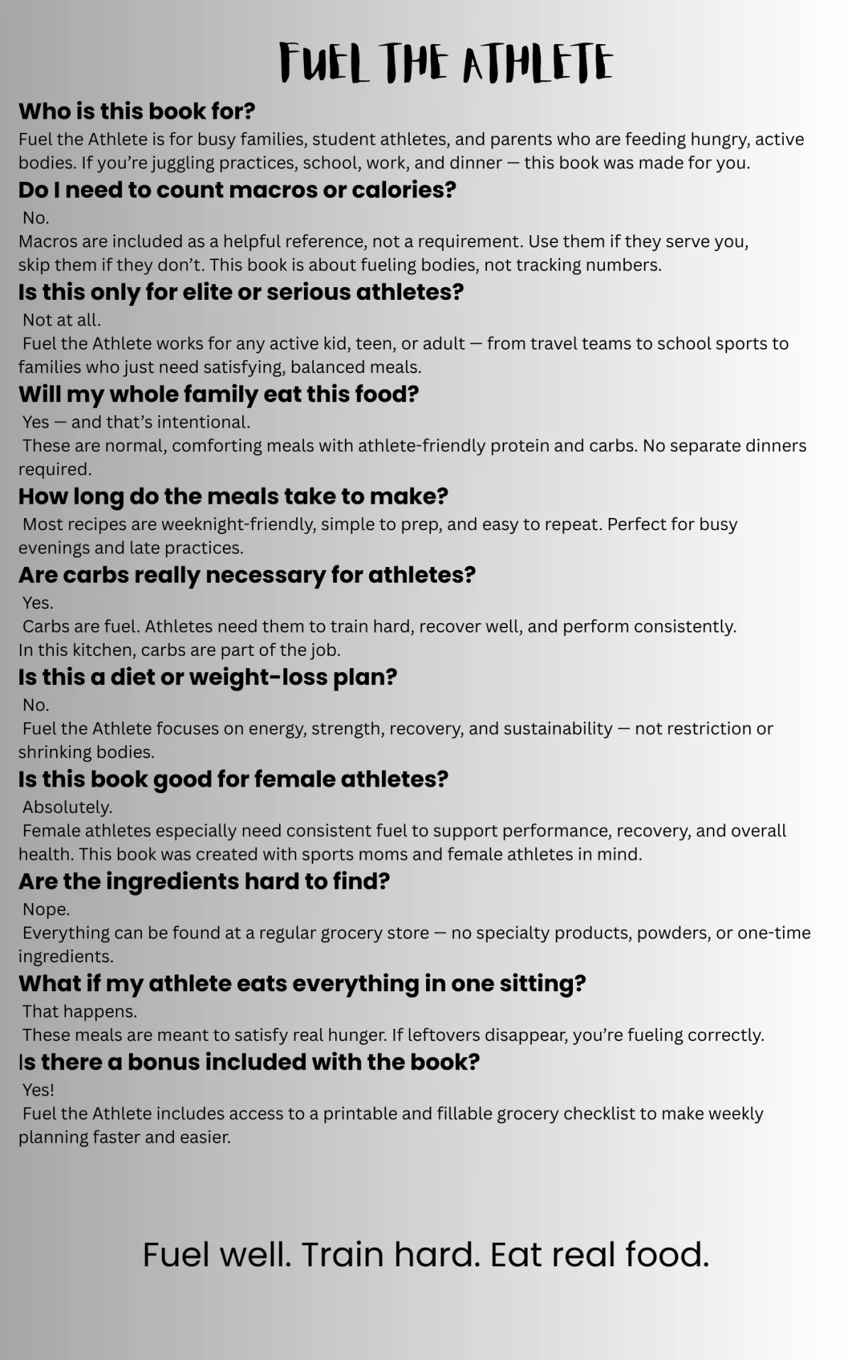 These cookbooks were created for sports families who need meals that work in real life. No specialty ingredients. No complicated prep. No cooking three different dinners to keep everyone happy. Just filling, repeatable meals that fuel athletes and make busy nights easier.